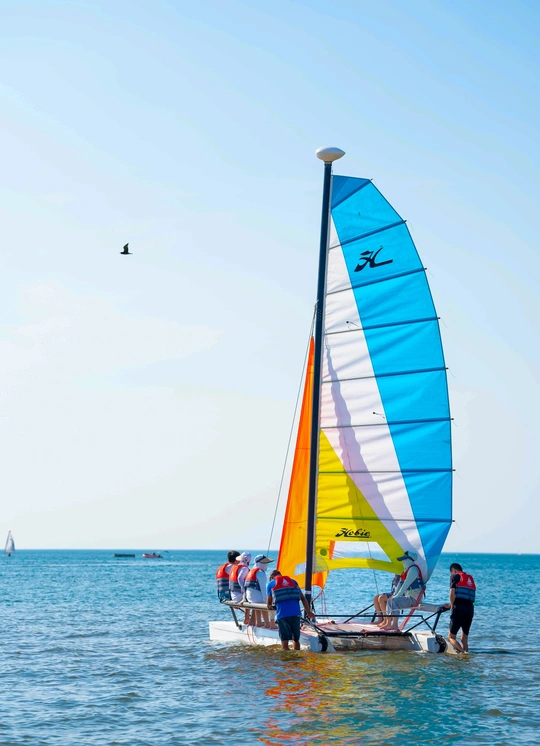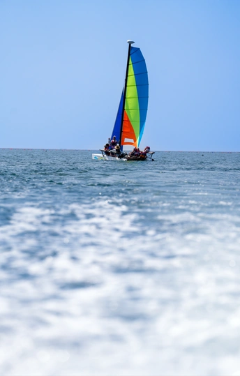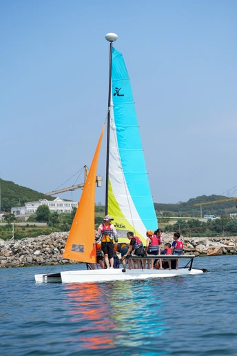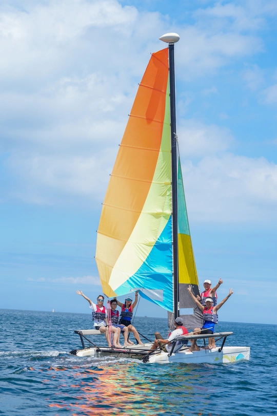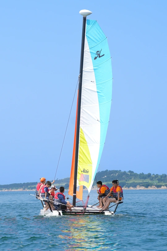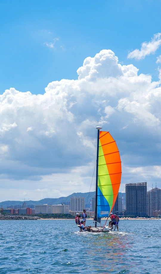 拍摄于山东威海金海滩,双体帆船在海上扬帆起航