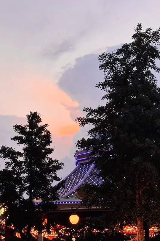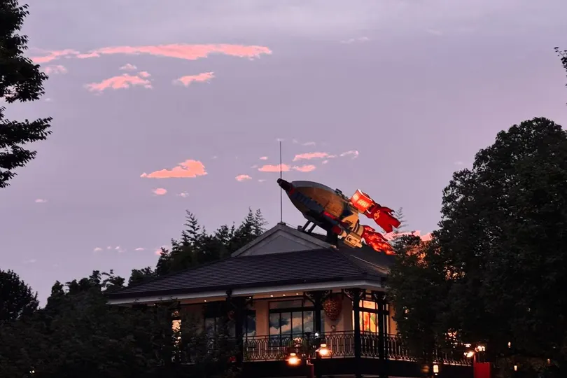 粉紫云霞铺就天际,复古火箭似要冲破梦幻,在游乐园的暮色里,藏着永不褪色的童心与对宇宙的绮想。
