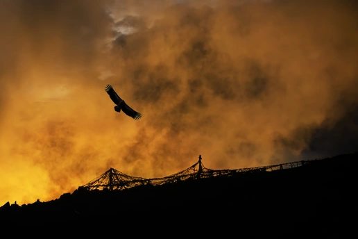 构图:极简主义的力量博弈,画面采用“天地分割”式构图:下方暗黑色的山陵与经幡构成稳固的横线基底,经幡的凌乱线条如大地的脉搏;上方被橙红云霞填满的天空形成压倒性的竖幅空间,而飞鹰以对角线姿态划破云层,双翼展开的锐角与经幡的水平走向形成张力对抗。飞鹰被精准置于黄金分割点,渺小的剪影在磅礴云势中却成为视觉锚点,这种“以小见大”的布局,暗合藏族文化中“生灵与天地对话”的宇宙观。 色彩:宗教美学的炽烈表达,以“黑-橙”为两极的色彩体系极具冲击力:云层被夕阳燃烧成从橘红到暗褐的渐变,中心区域的亮金如同火焰核心,边缘则晕染出烟灰紫的沉郁;山陵与经幡全为纯黑剪影,飞鹰的羽翼在逆光中透出细微的绒羽纹理。这种高对比度的色彩处理,既还原了高原日落时“火烧云”的视觉奇观,又暗合藏传佛教中“火供”仪式的象征——橙色代表智慧之火,黑色象征无明破除,色彩成为承载精神内涵的视觉语言。 情感:敬畏与自由的灵魂共鸣,作品传递出强烈的精神震撼:经幡的静默飘动与飞鹰的振翅翱翔,构成“静与动”的情感对话;云霞的汹涌如天地呼吸,而飞鹰孤绝的身影则彰显着生命的桀骜。观者能感受到双重情感冲击:对自然伟力的敬畏,以及对自由灵魂的向往。