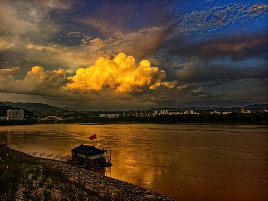 那天吃完晚饭,趿着拖鞋沿黄河岸慢慢晃——本来就是想消消食,脚边的碎石子踩得咯吱响,风里裹着点河水的潮气。 刚拐过岸坡,眼就亮了:天上那云不知怎么被烧透了,金红金红的浪似的往河面砸,连黄汤汤的水都裹上了层暖光。没顾上擦手机镜头的指纹,举起来就按——按下快门那秒,风正好掀了浮屋上的红旗,红得像把这黄昏的热乎气攥紧了。