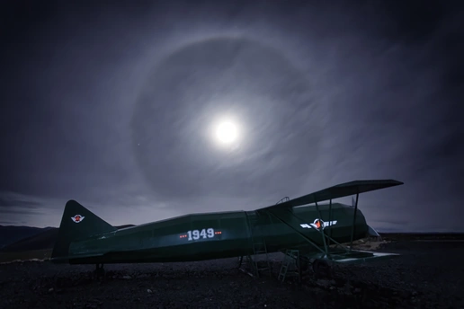 构图:几何与混沌的宇宙对话,画面以“十字交叉”结构构建时空坐标系:垂直方向,满月与巨大的月晕形成完美同心圆,如神祇的光环笼罩天幕,月晕的外沿与地平线相切,划定天地界限;水平方向,墨绿色双翼飞机以左翼高、右翼低的倾斜姿态横亘画面下部,机身中轴线与月晕圆心形成隐形十字,构成“天圆地方”的视觉隐喻。飞机的机械几何(直线机翼、矩形机身)与月晕的自然混沌(云层纹理、光晕渐变)形成强烈对抗,而机身编号“1949”的白色数字如时间戳,精准锚定了历史与现实的交汇点。 色彩:暗夜中的精神光谱,以“墨绿-银白-靛蓝”为三色体系,构建极具仪式感的色彩场域:机身的军绿色沉郁如青铜,在月光下泛着哑光金属质感,象征历史的厚重;月晕从中心的亮白向外晕染出银灰、淡紫,直至融入靛蓝色夜空,形成神圣的光域;机翼下的阴影与地面的砾石则沉入纯黑,强化了画面的纵深感。色彩饱和度被刻意压低,唯有“1949”数字与机翼红星标志保留锐利的白色,如暗夜中的火炬,成为视觉与精神的双重焦点。 情感:崇高与怀旧的时空共鸣,作品传递出复杂的情感张力:月晕的恢宏引发对宇宙的敬畏,飞机的静默唤起对历史的追怀。现代工业文明与自然奇观的碰撞无比精彩。