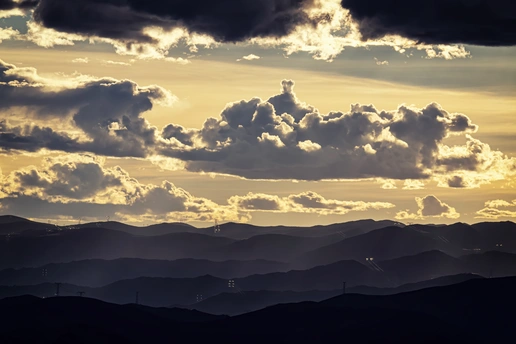 构图:层叠韵律中的时空交响 画面以“云层-光带-山峦”构建三重纵向层次:近景的山峦剪影如沉睡的巨兽,线条舒缓起伏,构成大地的基线;中景的云层团簇如凝固的浪涛,边缘被阳光勾勒出金边,形成视觉焦点;远景的光带从云层间隙流淌而下,如神祇的笔触分割天幕。横向维度上,云层的疏密变化与山峦的韵律形成呼应,电线杆的零星点缀打破绝对对称,赋予自然景观以人文温度,整体构图兼具秩序感与动态张力。 色彩:金与墨的光影狂想曲 以“暖金-深灰-米黄”构建色彩谱系:阳光穿透云层形成的米黄色光带是画面的灵魂,为厚重的云层镀上流动的金边;深灰的云影如泼墨般晕染天幕,与光带形成强烈明暗对比;远山的剪影融入暮色,化作最深沉的墨色。色彩过渡自然却充满戏剧性——同一朵云既有被照亮的暖调边缘,又有背光的冷调内核,光与影的博弈让静态画面产生流动感,宛如天地间正在上演一场盛大的光影魔术。 情感:敬畏与希望的精神共鸣 作品传递复杂的情感体验:厚重的云层带来压迫感,唤起对自然伟力的敬畏;而穿透云隙的金光则如希望的信使,在阴霾中撕开明亮的裂口。当观者凝视画面,会先被云层的磅礴震撼,继而在光光带的流动中感受到生命的韧性。