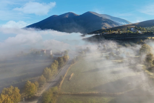 这幅晨雾山村图以精妙构图与诗意色彩构建自然意境。三层递进式布局:远景青黛山峦横向延展成稳定基底,中景云雾漫卷营造虚实相生的东方美学,近景村舍、道路与秋树锚定视线,引导观者从人间烟火渐入远山云雾,完成意境升华。 色彩上蓝、青、金三色和谐交响。澄澈蓝天与深青山脉形成冷调背景,晨雾泛着金辉,秋叶明黄点缀其间,冷暖碰撞强化空间纵深感,暗合"阴阳相生"哲思。雾气半透明质感处理精妙,既模糊村落边界使建筑与自然融合,又通过光影呈现流动感,赋予静态画面时间韵律。 情感传递"天人合一"的宁静与敬畏。薄雾中村庄若隐若现如世外桃源,道路串联人间烟火与自然秘境,暗示和谐共生。观者在云雾流动中感受时光缓慢,在远山静默中体会永恒力量,唤起对田园生活的向往。 主题隐喻"虚实相生"宇宙观。可见的村舍树木是"实",象征人类文明;缥缈云雾远山是"虚",代表自然奥秘,二者渗透诠释"道在万物"智慧。 艺术价值在于融纪实与写意。精确曝光控制展现专业技法,水墨留白意境超越风景记录,达"画中有诗"高度。"人隐于景"的处理凸显自然包容性与人类对诗意栖居的永恒追求。 以雾为纱,山为骨,路为脉,绘就藏村苏醒于缥缈仙境的田园诗画。