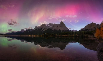 10.10号晚上。强烈的极光风暴笼罩着落基山脉。。这个美丽的哈林峰池塘让我记录下来极光刚刚爆发时刻的紫红色。那时候刚开始蓝调时刻而太阳也刚刚落山。