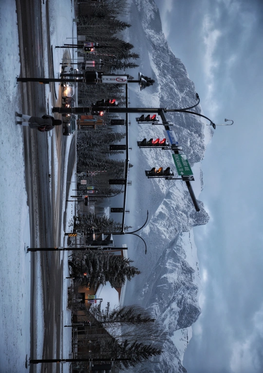 拍摄于加拿大班夫小镇班夫大道附近的路口,背景是落基山脉的雪山,可以看到标志性的Cascade Mountain等山峰。