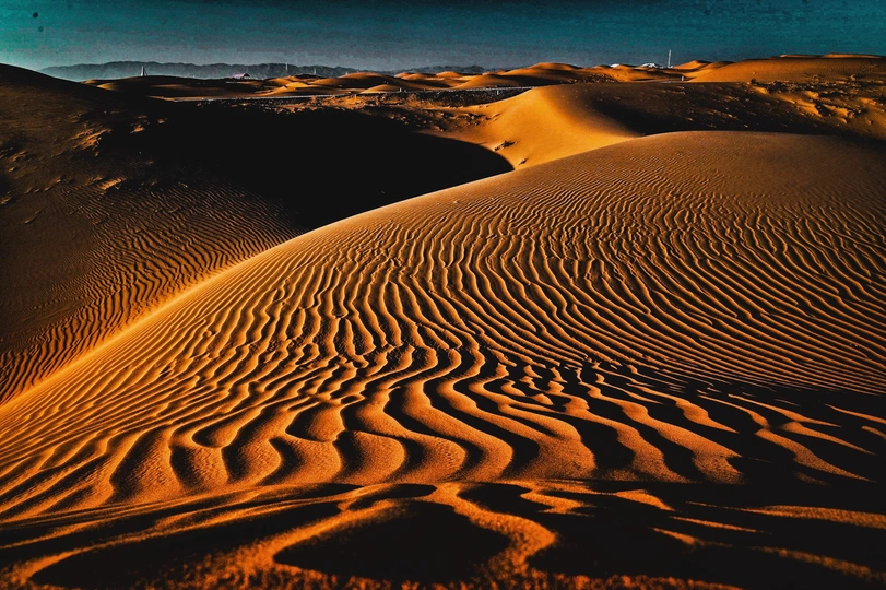 中卫的沙坡头,沙粒被日光焐成了金箔。那天我蹲在沙丘脊线,看风把沙纹梳成水浪似的褶子,远处天际线像被蓝墨晕开的宣纸。其实前一晚沙尘暴刚过,我差点因为漫天黄尘放弃拍摄。但凌晨摸黑爬到沙丘顶时,风突然静了,沙坡像被上帝用刮刀重新塑过形——每道纹路都利落得像版画,阳光斜斜切下来,把沙的起伏雕成明暗交织的绸带。我架相机时,指缝里还嵌着沙粒,却觉得这粗糙里裹着股“天地亲手打磨艺术品”的隆重,按下快门的瞬间,连风都像在为这沙海的“黄金浮雕”配乐。