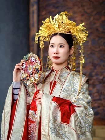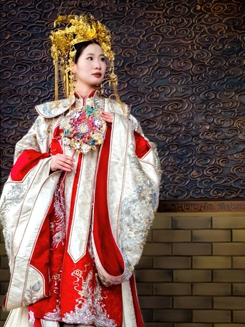 在济南大明湖景区的超然楼前,拍摄了一组国风人像,表现华丽的汉服服饰及传统汉服婚礼妆造。