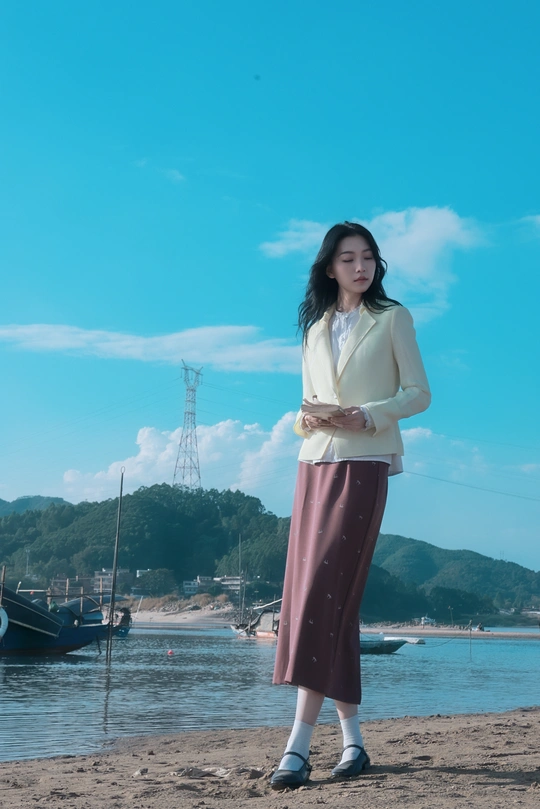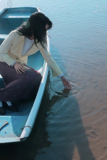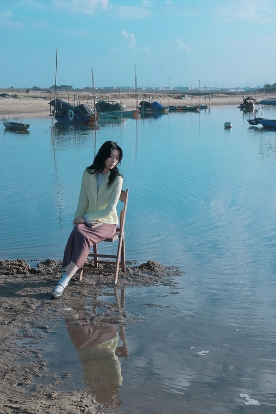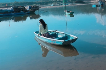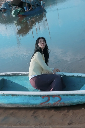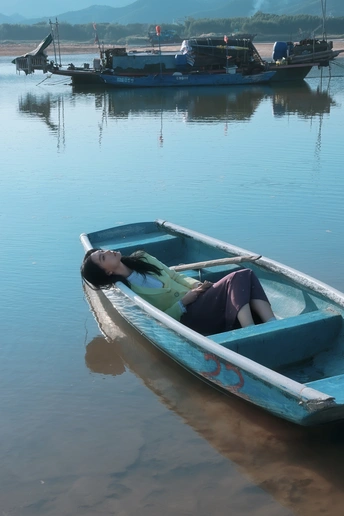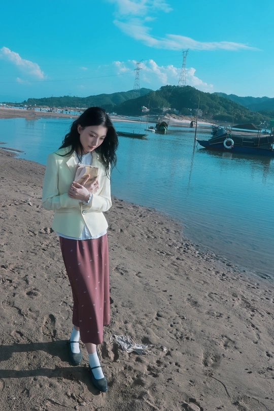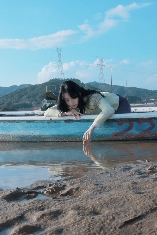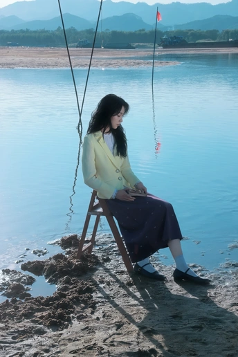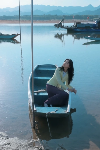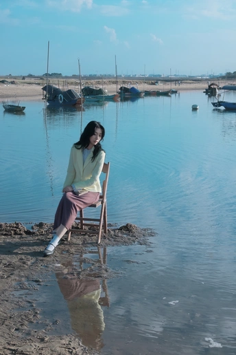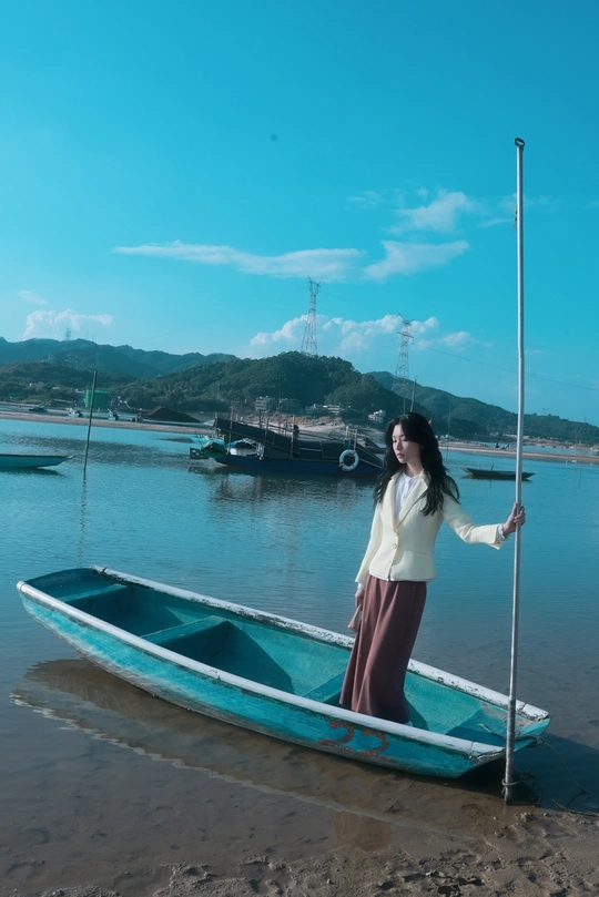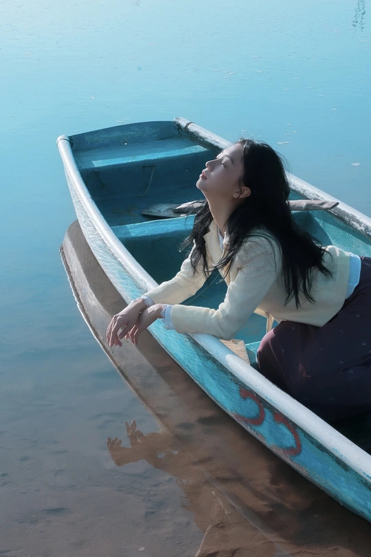 粼粼水波是铺展的信笺,搁浅的蓝舟载着未寄出的思绪,她静坐水畔,似在等一场潮汐捎来的回音,又像在与这片温柔的水域,写下独属于自己的私语。