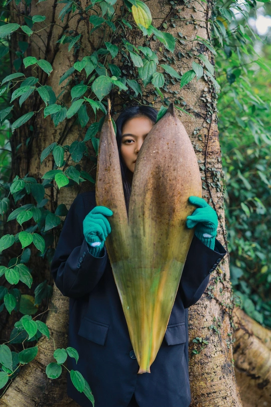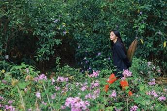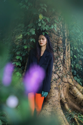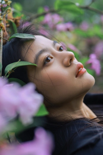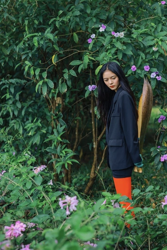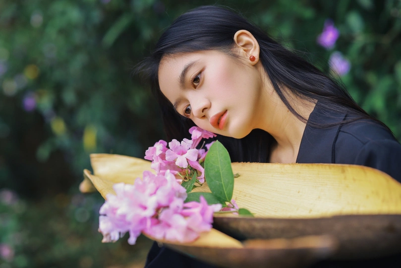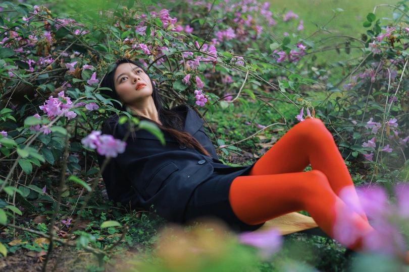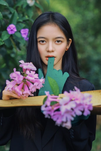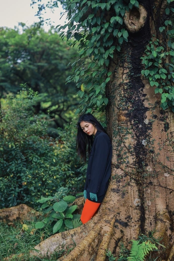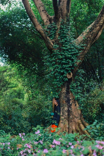光线穿过枝叶,把心事切成细碎的光斑,她却只是安静地站着,用一束凝眸,回应整片森林的低语。