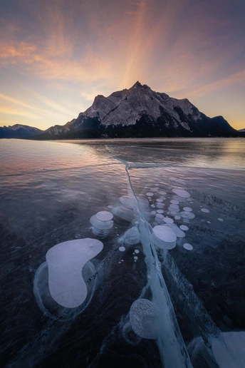这张是2025年一号在加拿大冰泡湖拍摄的照片。冰气泡和冰裂缝配合美丽的朝霞和雄伟的落基山形成了一幅美丽的画面。