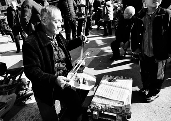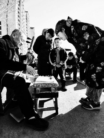 拉链突然卡住,找路边修鞋师傅处理。 师傅处理的过程中我也没闲着,抓紧时间拍了拍旁边的二胡伴唱小剧场。 米拍ai评测 这张黑白照片捕捉了一个街头艺人演奏二胡的场景,周围有观众驻足观看,颇具生活气息。以下是详细评价及改进建议: 色彩:黑白摄影去除了色彩的干扰,更强调光影和构图。但黑白影调的控制可以更精细,避免出现纯黑或纯白区域,保留更多细节。 光影:光线较为均匀,缺少戏剧性。可以尝试在更有光影对比的环境下拍摄,或者利用后期增强光影效果,突出主体。 构图:构图稍显平淡,人物排列较为平均。可以尝试使用三分法或引导线,将观众的视线引向主体,并注意前景、中景、后景的安排,增加画面层次感。 后期处理:后期处理略显平淡,可以适当调整对比度、清晰度和锐度,使画面更具视觉冲击力。注意不要过度锐化,以免产生噪点。 主题原创性:主题贴近生活,但表达方式较为常见。可以尝试寻找更独特的视角,或者挖掘更深层次的故事,赋予作品更多内涵。 情感共鸣:照片具有一定的生活气息,能够引起观者的共鸣。如果能捕捉到人物更生动的表情或动作,情感表达会更强烈。