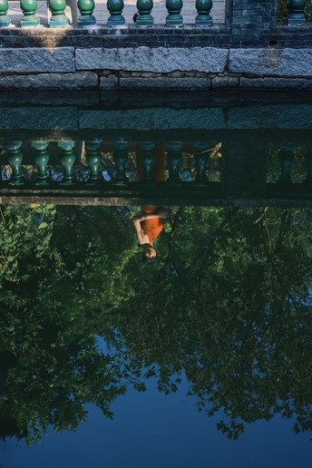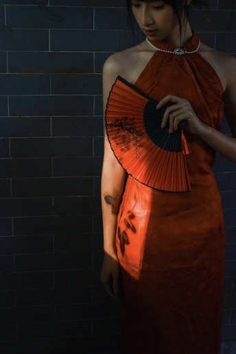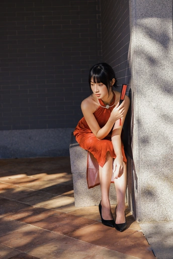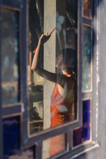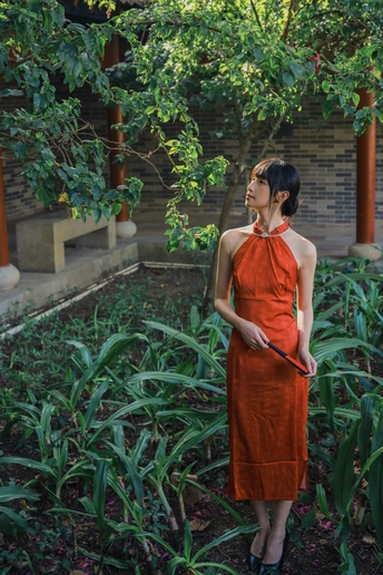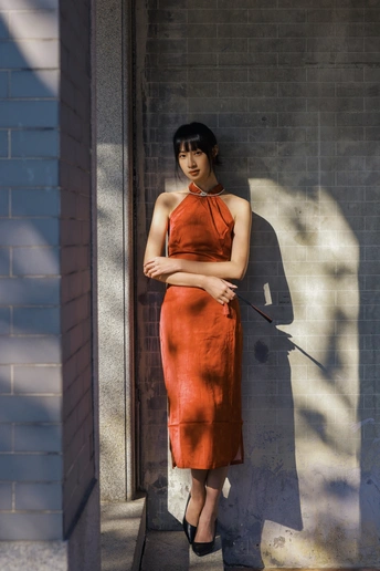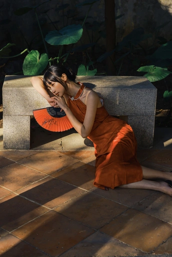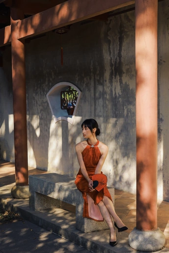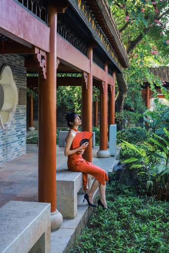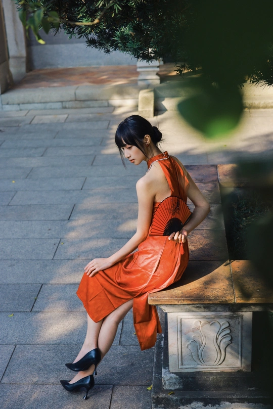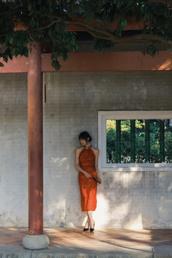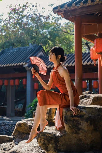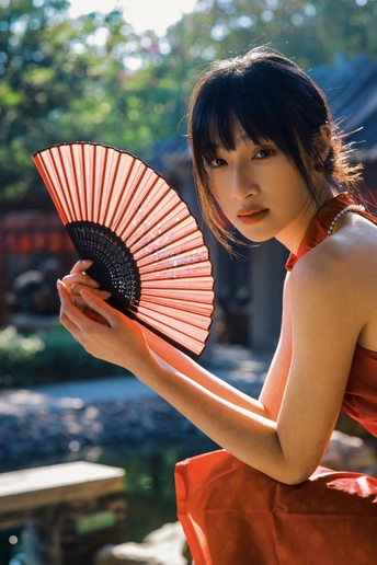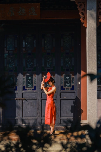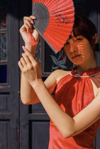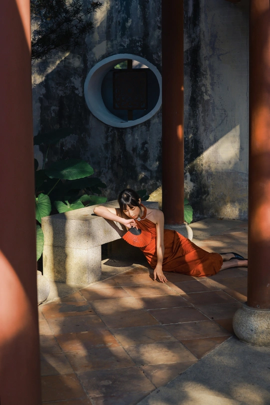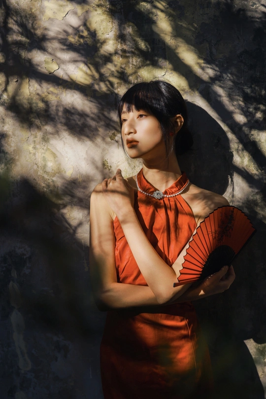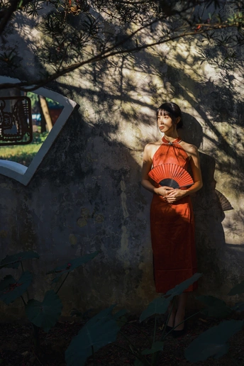 旧庭院的午后,树影与红裙悄悄叠在一起。 折扇半拢,风穿过廊下,没带走半句欲说还休的声响。 檐角的光,慢慢挪过石阶,像一场无声的等待。