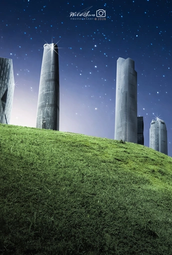 这张图取景于广州珠江新城,我通过后期得到了这张照片。于是有了这句话——星光落满摩天楼,青草漫过城市的褶皱,一半是人间烟火,一半是自然温柔。