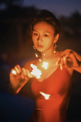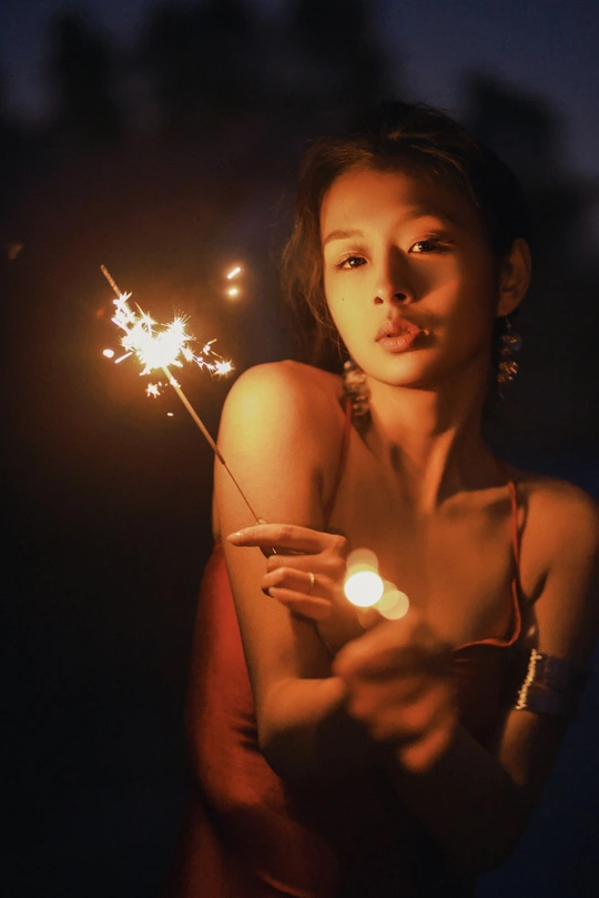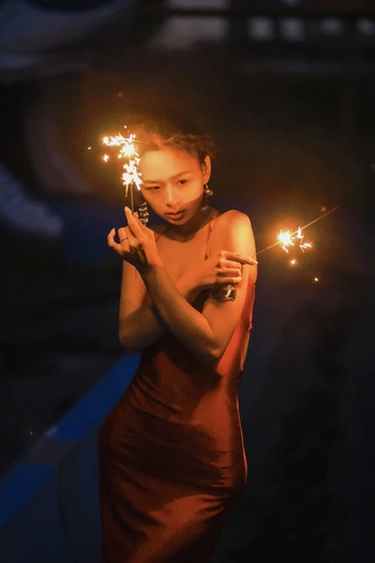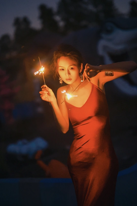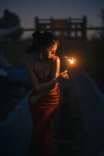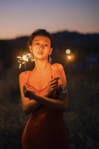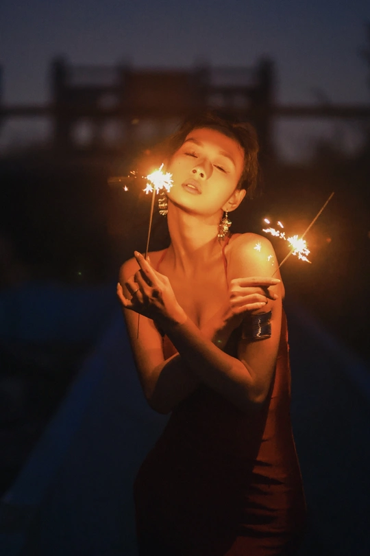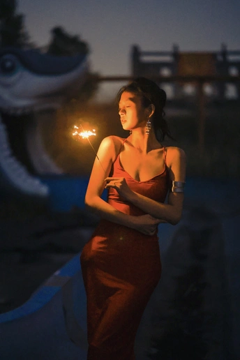 暮色里的一场焰遇,红裙与星火撞了个满怀,转瞬的光亮,也成了刻在黄昏里的温柔。