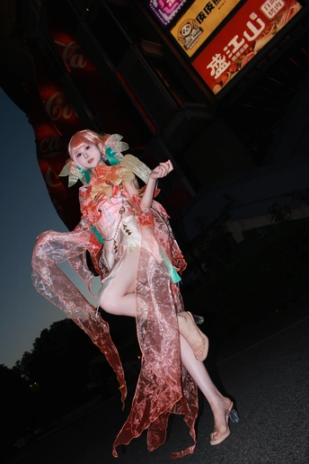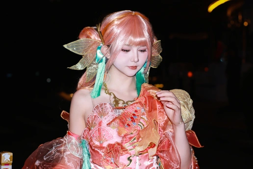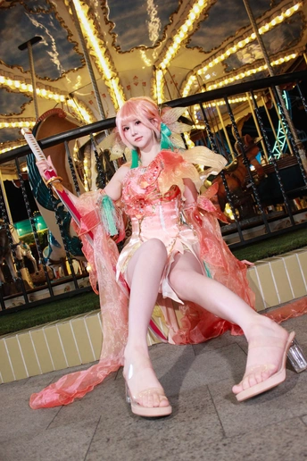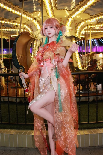 这组作品是《永劫无间》胡桃「樱云天女」皮肤的Cosplay演绎,以实景融合角色的和风奇幻美学,既精准还原皮肤设计细节,又通过场景与姿态塑造出独有的氛围感。 造型上紧扣「樱云天女」的核心设定:樱花粉的发色搭配金箔质感的鱼鳍状发饰,与皮肤的“樱云”主题相呼应;橘粉渐变的纱质衣装融入和风刺绣与珠饰,青绿色流苏点缀其间,既保留了胡桃的少女娇俏,又还原了皮肤中仙幻的天女气质;手持的太刀道具则衔接角色的战斗属性,让柔美造型与利落的武器形成视觉反差,贴合胡桃在游戏中的角色定位。 拍摄场景选取旋转木马与城市暮色街景,暖光旋转木马的童话感契合「樱云天女」的浪漫仙幻基调,坐姿的慵懒优雅将角色的柔美展现得淋漓尽致;暮色街道的冷调光影下,腾空跃起的姿态复刻了游戏中胡桃的飘逸身法,让静态的Cos作品拥有了动态的战斗画面感。从造型还原到场景叙事,让胡桃「樱云天女」的角色形象变得立体鲜活。
