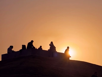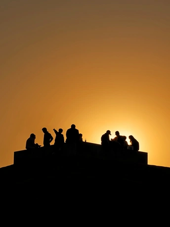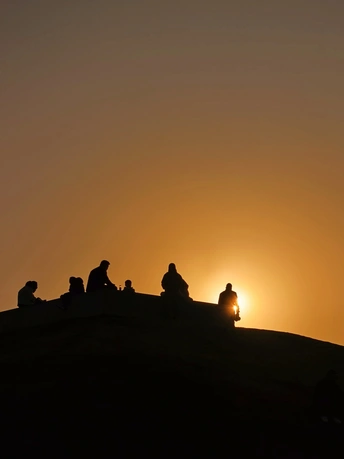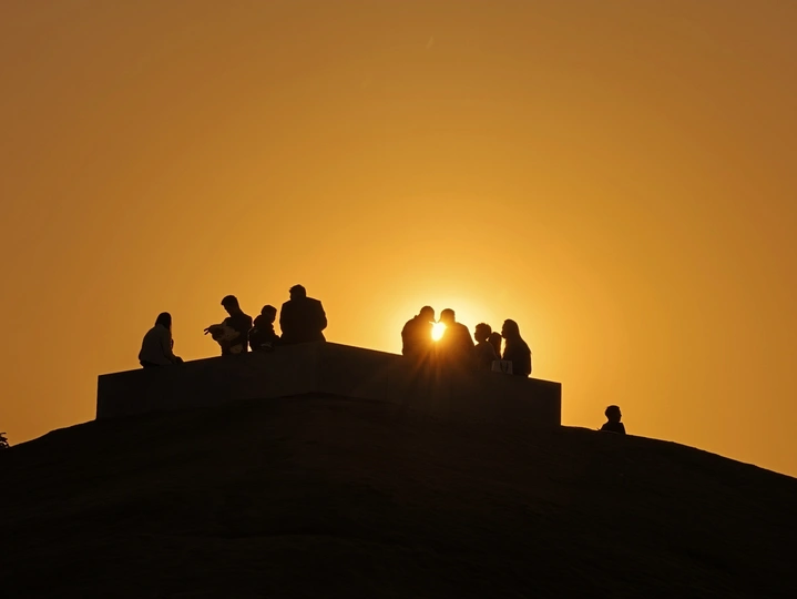 橘色的落日把天空熬成蜜色,人群的剪影嵌在温柔的暮色里。有人并肩说着话,有人独自望着光,风掠过草坡时,把琐碎的烦恼都吹向了远处。我们总在追赶日出的热烈,却忘了落日也在把温柔揉进每一个平凡的瞬间。此刻不用赶路,就坐在这山坡上,和落日对望,和身边的人共享这片刻的松弛,原来人间美好,不过是有人陪你看一场慢慢沉下去的夕阳。