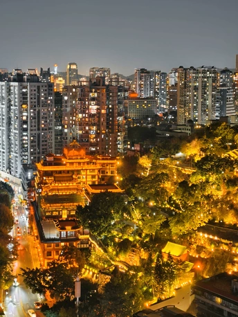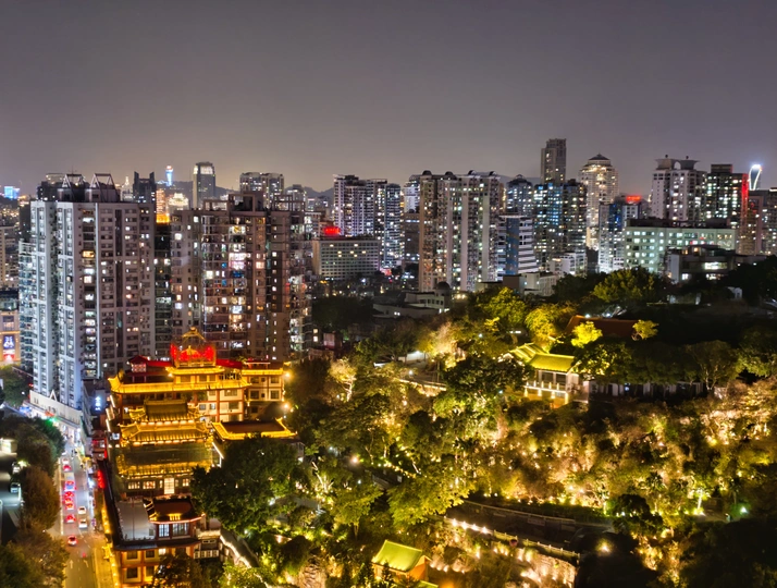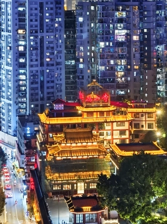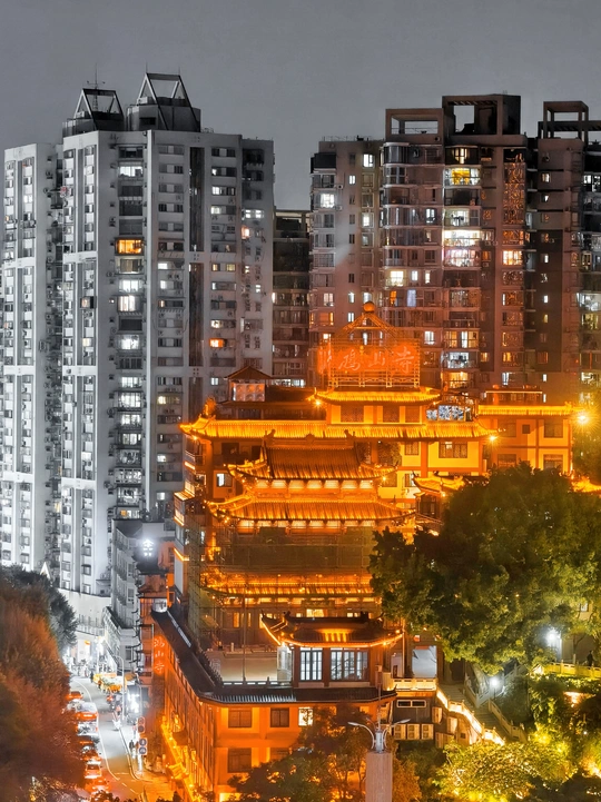 在厦门最烟火气的高楼缝隙里,藏着一座鎏金的古寺-鸿山寺。因夜间的灯火有点重庆著名景观的感觉,被誉为厦门洪崖洞。 暖黄的檐角挑着千年的月色,红墙外是万家灯火的人间。当现代楼宇的冷硬线条,遇上飞檐翘角的温柔弧线,钢筋水泥里便长出了诗意。晚风吹过,寺檐的铜铃轻响,混着街边火锅的香气、车流的鸣笛,成了独属于山城的夜曲。 在这里,不必逃离城市,就能在高楼与古刹的对视中,找到片刻安宁。