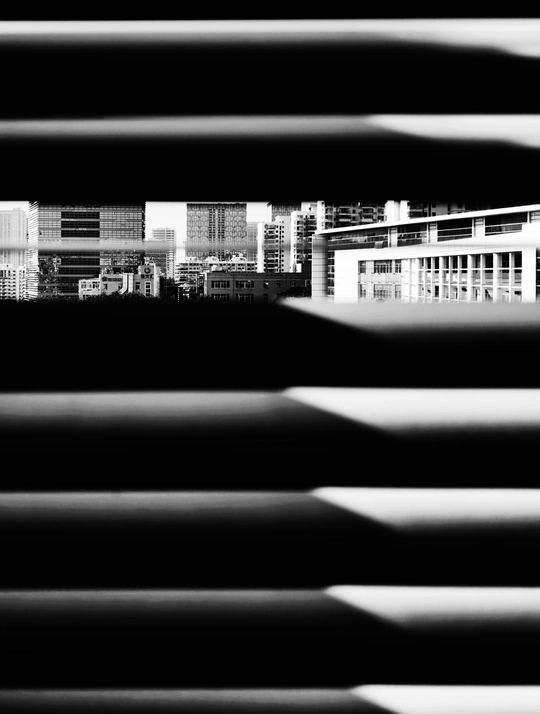 金属叶片将现实切碎,黑白是唯一的语法。 高楼的棱角在缝隙里变形,玻璃幕墙反射着没有温度的光。 这不是风景,是文明的切片—— 秩序与混沌同框,坚硬与柔软共舞。 我们都是透过格栅窥视世界的囚徒, 在明暗交替间,认领各自的坐标。