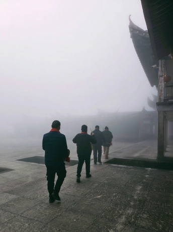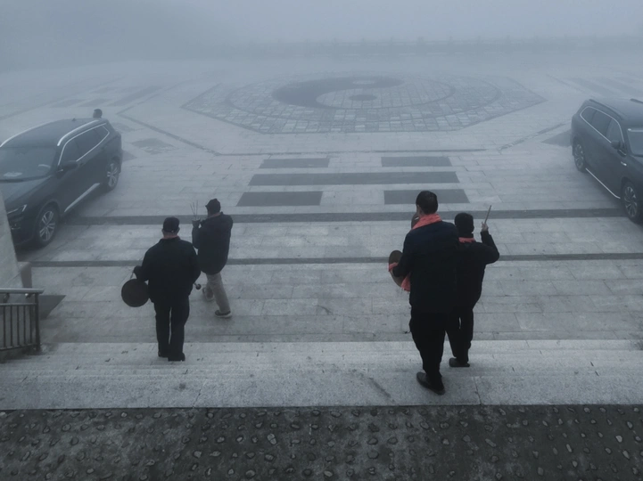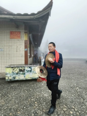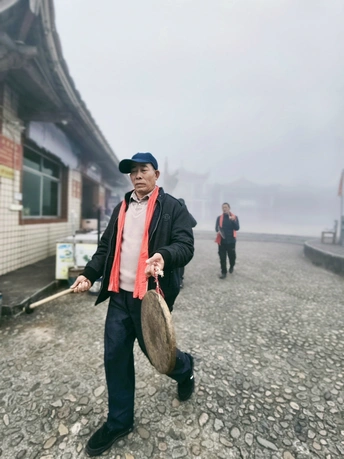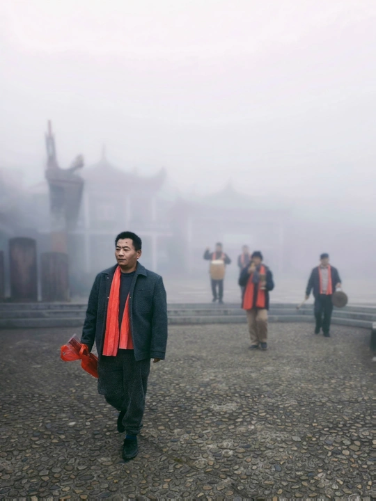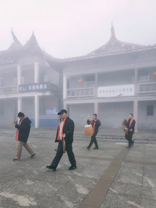 雾锁石牛山,红绸系在老棉袄的领口。 鼓点敲碎山雾,烟火气混着松香漫开。我们走在青石板上,脚步踏得比鼓点更沉。 这不是一场表演,是山里人最虔诚的仪式。红绸在雾里飘着,像要把天上的神,牵回这方烟火人间。