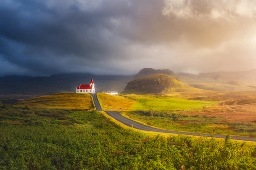 冰岛斯奈山半岛的红教堂,日落时刻迸发出神圣的光辉。