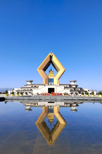 午后法门寺的静谧时光,水面倒影与天空辉映,出现了水天成一色的蓝,更加映衬出建筑在阳光下的金光闪闪。