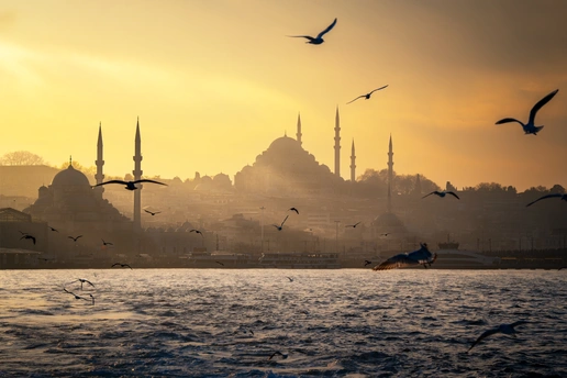 当金角湾的浪波接住最后一抹夕阳, 蓝色清真寺的尖顶便在柔光里舒展成凝固的诗行。 飞鸟掠过,把伊斯坦布尔的晨昏轻轻衔在翅尖, 这一刻,欧亚大陆的风都慢了下来。