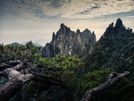 画面呈现的是三清山的经典景观,山峦层叠,云雾缭绕,宛如中国传统水墨画中的留白与晕染,尽显自然之雄奇与东方意境之美。远处山脊上隐约可见栈道,为这幅天然画卷添上人文足迹。