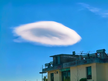 澄澈的蓝底之上,一朵云长成了温柔的模样,悬浮在楼宇之上,像宇宙悄悄投递来的浪漫信笺,干净、柔软,又带着不期而遇的奇幻。风把云揉成温柔的形状,人间寻常的屋顶,也接住了这天赐的浪漫。