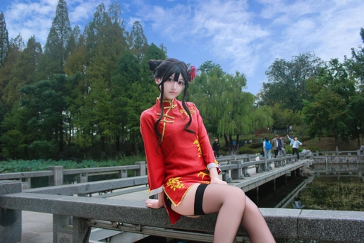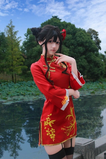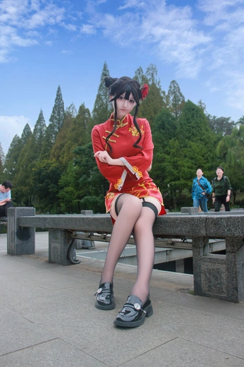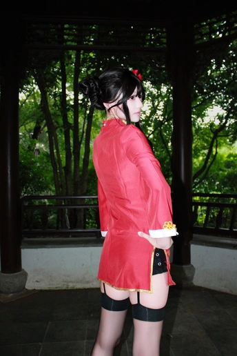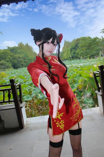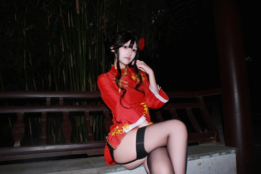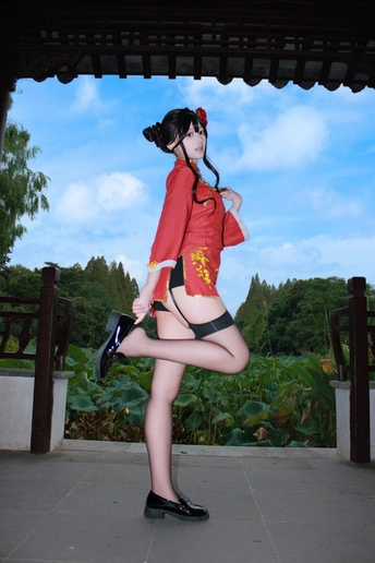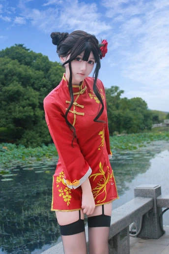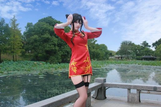 本作品为Galgame《星光咖啡馆与死神之蝶》角色四季夏目(枣子姐)旗袍皮肤的Cosplay创作。 - 造型还原:以双发髻配红花发饰,正红色改良旗袍绣金色花卉纹样,搭配黑色吊带袜与亮面小皮鞋,精准还原角色的东方韵味与俏皮气质。 - 场景叙事:取景于江南园林,以荷塘、亭台、竹林为背景,通过日景与夜景的切换,构建出清新明快与静谧雅致的双重氛围,让角色在古典空间中鲜活起来。 - 创作理念:借园林的东方美学强化旗袍的文化底蕴,在二次元角色与传统场景的碰撞中,传递出传统与现代交融的视觉张力。