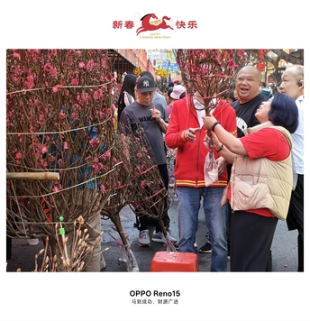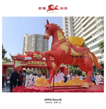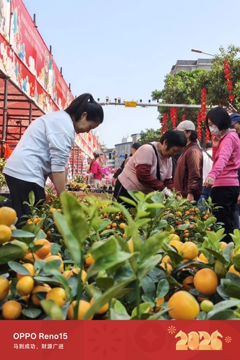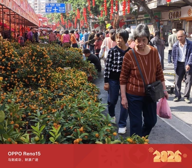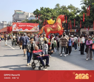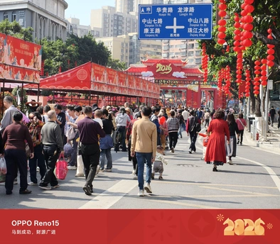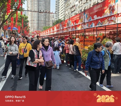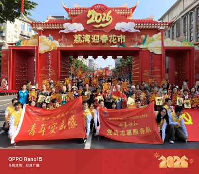 荔湾路与中山七路交界处华灯初上、锣鼓喧天。2026年荔湾区传统迎春花市亮灯仪式在此举行。以岭南经典牌坊为设计核心的迎春牌楼正式点亮,华彩光影映照夜空,花市各项准备就绪,为市民和游客带来新春的祝福与喜悦。