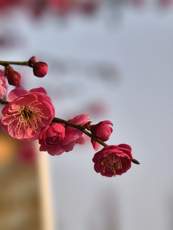 疏影横斜,暗香浮动。 这一枝红梅,是冬的余韵,也是春的序章。 在澄澈的蓝天下,它不与百花争艳,只以一抹朱砂色,晕开了整个季节的温柔与风骨。