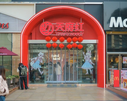 天府红位于成都天府广场旁,是一个以二次元文化为主题的购物中心。该场所由以前的百货大楼改造而成,汇集了丰富的二次元业态,被部分爱好者称为“成都秋叶原”。商场共八层,其中一至五层为核心二次元区域。该区域容纳了约40个二次元品牌与20多家周边专卖店,涉及IP数量超过百个,并设有宅舞区、舞台区与棚拍区等专属活动空间。六至八层则为餐饮与影院功能。天府红的主要消费群体为学生,尤其是小学生。他们在周末常聚集于此,进行购买周边(即“吃谷”)、与同好交流、参与活动或与coser合影(即“集邮”)等社交行为。周边商品涵盖徽章、挂件、立牌、手办等多种类型,价格从十几元至数百元不等,消费资金多来源于零花钱。