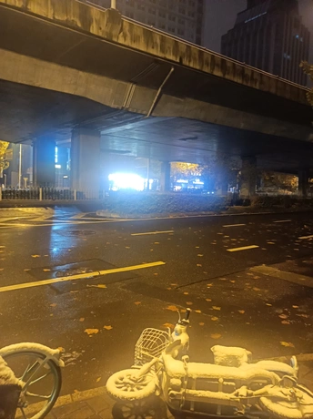 合肥某地铁口旁的雪景,还有一辆倒下的电动车