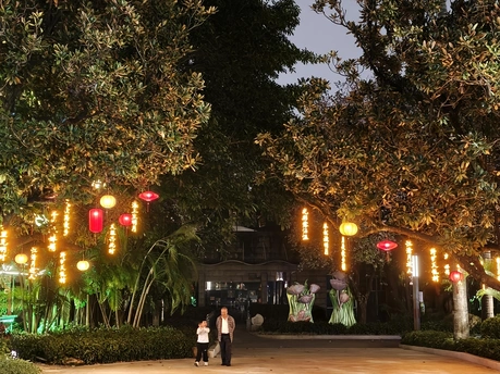 大年初五,爷孙俩饭后散步在古诗词的灯牌下。甚是温磬