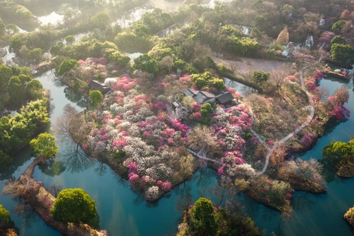 航拍西溪湿地的梅花林