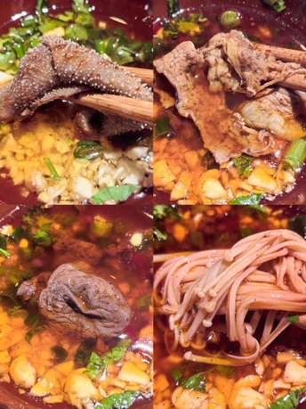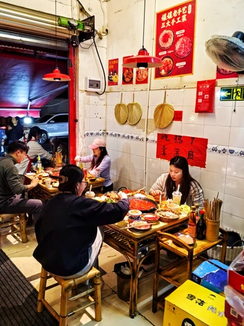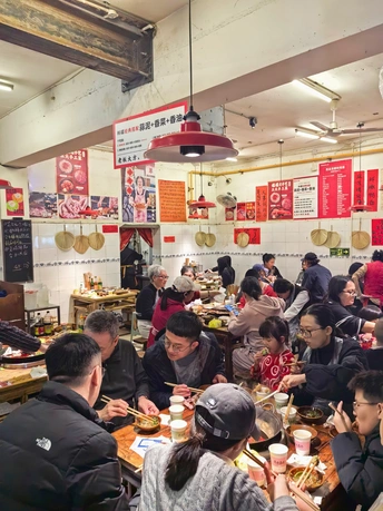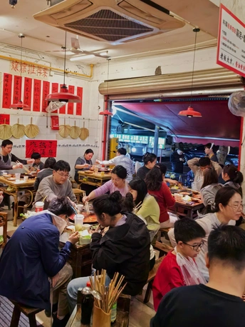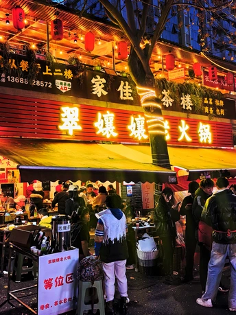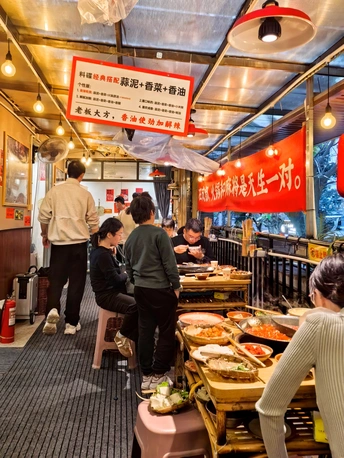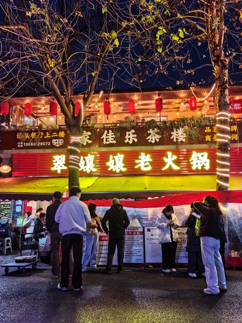 🏠翠嬢嬢老火锅,始于2013年,成都锦江区永兴巷居民楼下的几张木桌,是它的起点。创始人“翠嬢嬢”,原是食品厂老职工,退休后没闲着,把家传的火锅底料方子搬出来,在老社区里支起了摊子。没有装修,没有宣传,只靠每天现炒的牛油锅底和街坊的口口相传,慢慢成了春熙路商圈里,外地人扎堆的“隐藏据点”。现在的翠嬢嬢,已经传到了第二代手里。 ⏰来这儿吃饭,得有耐心。 第一次来,APP上提前排了一小时到店,到现场显示还要等半小时以上,门口的小哥直接摆手:“别等了,隔壁去吃双流老妈兔头。”第二次学乖了,提前一个半小时在APP上排号,30桌的队伍,大概40分钟就轮到了。分店的人会少一些,不想排队的可以往那边去。 🍃店里的环境,是老社区的真实感。 老房子简单改造过,竹编的桌椅,墙上贴着红底黑字的“嬢嬢推荐菜”,天花板上挂着红色的灯笼,空调和风扇一起转,烟火气裹着热气,扑面而来。来吃饭的人里,有不少外地游客,带着小朋友的家庭也多,隔壁桌还在讨论第二天去三星堆的行程。 🍽️上菜速度不算快,素菜先上,荤菜要等一会儿。 人多的时候,偶尔会有送错菜的情况,服务