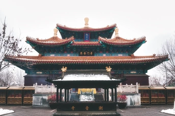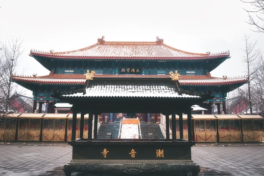 六百年潮音寺可知天津卫,永乐二年与天津卫一共建立,位于海河入海口,是船只入海时见到的第一座寺院,外形以海和船为特点,以观音菩萨的由来及鲁班巧修潮音寺等传说而赋之几百年的传奇色彩,也是全国少有的坐西朝东的庙宇。传说是刘家兄弟两海上遇难要饿死的时候遇见了一位老奶奶,不仅给予了吃食,并带他们返回了岸上,上岸后老奶奶变成了泥像,大家才悟出菩萨下凡保佑黎民百姓。随后,居民便集资在酸枣树旁盖了三间茅屋庙宇。依照观音菩萨盘坐的方向,庙宇也座东朝西,面向大海,举为:南海大寺。而现在的名字是之后嘉靖皇帝重修寺庙后御笔题词改为:潮音寺。后又经过康熙,乾隆两位皇帝亲临,拨款修缮声名远扬。进近代曾任民国总统的曹锟,出生在潮音寺西南侧。据说,曹锟从小经常聚集小伙伴在潮音寺玩耍.一天,他们在寺庙后院发现一只奇形大壁虎,小伙伴们都慌忙逃跑,独有曹锟用树枝戏逗壁虎,毫不害怕,乡人于是互相传说:今日小曹锟戏逗壁虎,将来必定不凡。民国初年,军阀混战,曹锟凯旋回乡。为庆祝胜利,拨款重修潮音寺,并在寺的正殿屋脊上增塑了五狮捧月图,山门屋脊上还塑了”平安”二字,使潮音寺焕然一新。寺内珍藏新版《龙藏》一部。