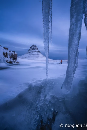 冰帘裹着寒气,在取景框边缘凝出剔透的棱。内侧机位把冰岛草帽山(Kirkjufell)稳稳框在冰瀑中央,463米的山体覆着薄雪,线条利落如倒扣的草帽。冰隙漏进的柔光,给山岩镀上冷金;偶尔碎冰坠落,在静谧里敲出脆响。脚下是冻硬的溪石,远处天光漫过云层,与冰帘的蓝、山体的褐、天空的灰紫叠成沉静的层次,是极寒里独有的梦幻画面。