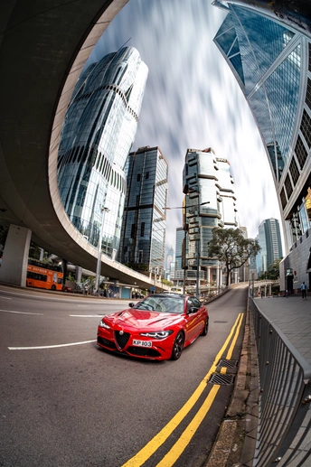 这张照片用超广角仰拍,把阿尔法罗密欧Giulia的运动感和香港中环的摩天楼群框进同一画面,弧形天桥与建筑垂直线条形成强烈透视,让汽车成为视觉锚点。色调上保留了车身的正红,建筑玻璃偏冷调蓝灰,冷暖对比突出,再通过明度建筑后期强化了楼宇的明暗层次,让城市肌理更有质感。