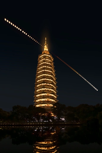 画面主体是世界第一高佛塔,153.79米的常州天宁宝塔。月全食从初亏到复圆过程的轨迹被完整记录,并与宝塔同框呈现,使用广角移轴保证塔身竖直,将地方建筑与特殊天象并置在一起。