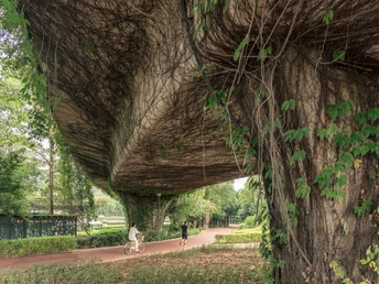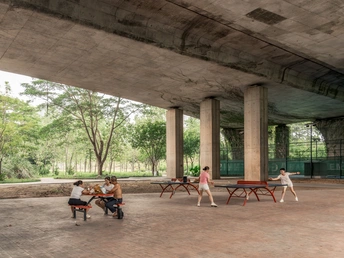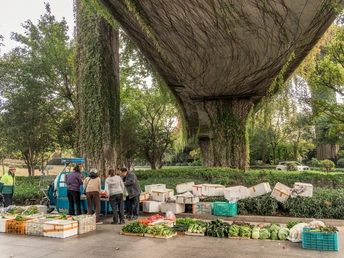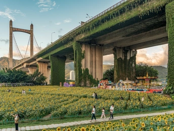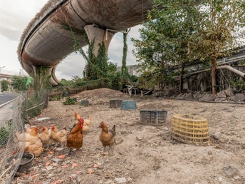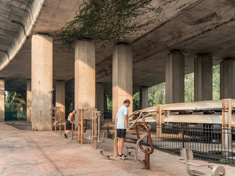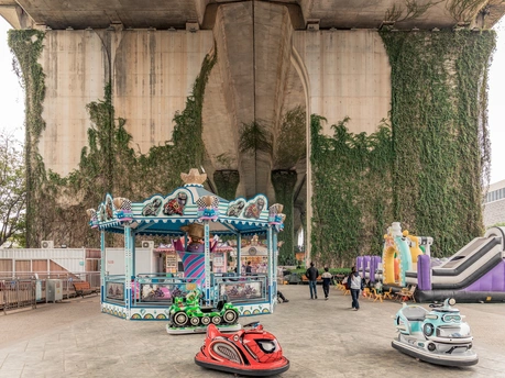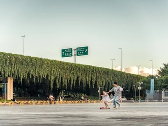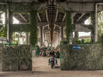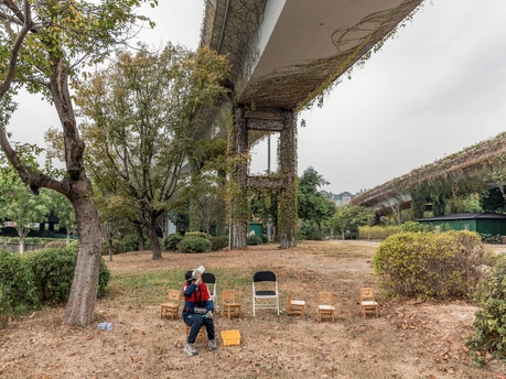 在城市规划的既定逻辑里,高架桥是服务于快速通行的线性基础设施,桥底空间多被定义为“非停留”的过渡地带,它们往往坐落于城市建成区与郊野乡村的交界,天然带着城乡过渡的空间属性。 我用镜头记录下这里的日常:爬满桥体的爬山虎为坚硬的水泥结构覆上自然肌理;城市居民在此健身、休憩,完成日常的休闲社交;周边的摊贩在此设摊,原生民居与高架相邻而存,乡土的生活方式在此自然生长。 这组作品,是对工业基础设施在现代城市中多元可能性的客观呈现。我无意评判既定的空间定义,只是记录下自然、建筑、城市与乡村、人与空间,在此处形成的共生状态。这些桥底空间,不止是通行的通道,更是容纳多元日常的城市容器。