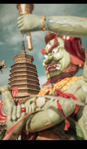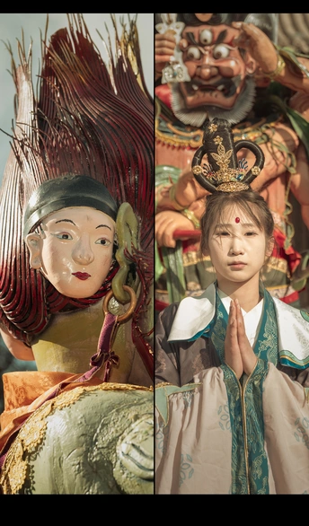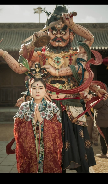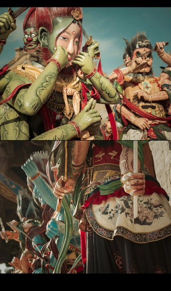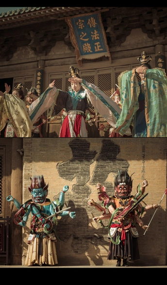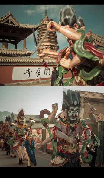 十大明王游神 大同浑源县永安禅寺的一组元代壁画。这组壁画是汉传佛教密宗艺术的巅峰之作,也是中国现存为数不多的完整十大明王图像之一。 其中最出名的就是“不动尊明王”,也被称为“撕脸明王”。他一手持剑,一手撕开自己的脸皮,露出里面的佛面,象征着为了寻求真理,必须直面内心最真实的自己。 不动尊明王(大日如来化生) 步掷明王(普贤菩萨化生) 马首明王(观音菩萨化生) 降三世明王(东方阿閦佛化生) 甘露军荼利明王(南方宝生佛化生) 大力明王(西方阿弥陀佛化生) 无能胜明王(地藏王菩萨化生) 焰发德迦明王(文殊菩萨化生) 大笑明王(虚空藏菩萨化生) 大轮明王(弥勒菩萨化生)