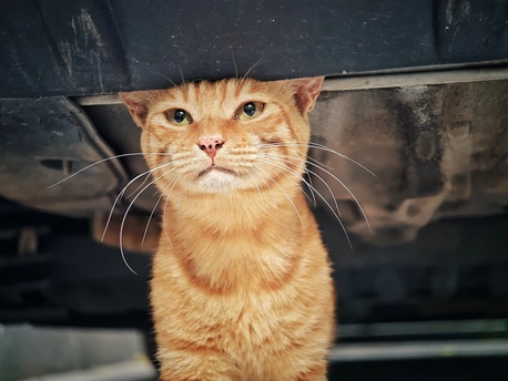 车底下突然探出个橘猫脑袋,像个神秘观察员,它的胡须随着呼吸轻颤,仿佛在丈量着这个世界。