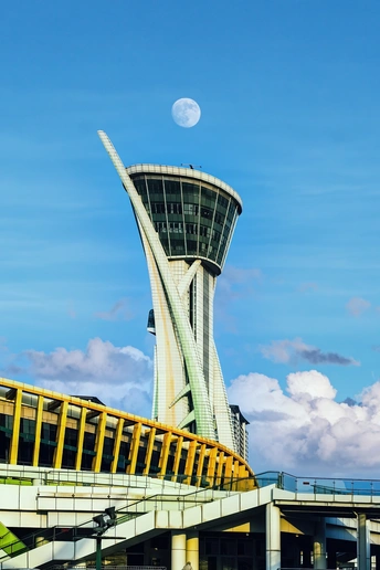 《月耀塔巅:城市异度空间的邀约》:“月耀塔巅”描绘出月亮照耀在塔顶的奇幻场景,“异度空间的邀约”增添了神秘和吸引力。 构图上,采用低角度仰拍,将指挥塔的挺拔感拉满,前景的建筑结构与塔身形成层次,月亮的位置恰好成为视觉点缀,让画面平衡又不失灵动。色彩上,澄澈的蓝天与洁白的云朵铺就清新底色,指挥塔的冷色调玻璃与暖黄色建筑构件形成冷暖对比,既凸显建筑的现代感,又让画面多了份柔和温度。 情感层面,这张照片藏着城市里的隐秘浪漫:白日的天空悬着月亮,忙碌的建筑与静谧的天体相遇,像在诉说日常里的小惊喜,让人在熟悉的城市景观里,读出一份意外的温柔。主题上,它聚焦现代建筑与自然天体的交融,展现了城市发展与自然韵律的和谐共生。 艺术价值在于,它打破了“日月不同框”的常规认知,用镜头捕捉到城市与自然的奇妙联结,让普通的建筑照拥有了诗意,每一处线条、每一抹色彩,都在传递着日常里被忽略的美好,成为能唤起人们对城市重新审视的视觉载体。