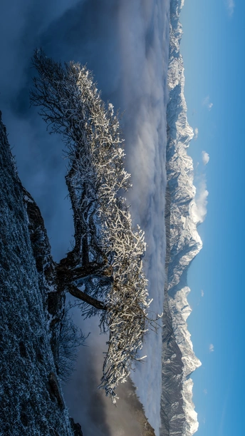 “凌晨5点守候|我看到了雾凇‘贡嘎迎客松’,晨光掠过树梢,海天为之一色。 牛背山红岩塘,海拔3333米,气温-10℃; 松枝般的虬曲身姿,是狂风雕刻数百年的勋章,此刻它披上雾凇,傲然迎向“蜀山之王”。 他似乎骄傲的呐喊:“坚韧的生命从不需要被定义”。