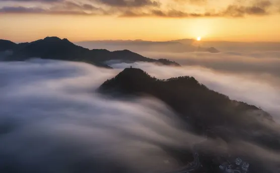晨雾如瀑,漫过石潭的层叠山峦,在风里铺成流动的白绸。黛色山尖与隐约屋舍在云浪中浮沉,像一幅晕开的水墨长卷。云雾漫过山脊的瞬间,是天地间最温柔的奔涌,藏着皖南山野独有的清寂与壮阔。