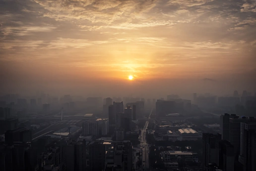 构图上,采用对称式构图,太阳居于画面中上部,城市建筑以地平线为界分布两侧,一条道路纵向延伸,如纽带串联起天地与城市,让画面平衡且富有纵深感。色彩上,暖调落日与冷调城市剪影形成强烈对比,霞光晕染的天空与灰蒙的城市建筑交织,营造出朦胧又温暖的氛围。 情感层面,这张照片藏着城市的温柔与宁静:黄昏的薄雾消解了钢筋水泥的冰冷,让人在宏大场景中找到内心的平和。主题上,以黄昏为幕布,定格城市的日常律动,展现现代都市的蓬勃生命力与昼夜交替的诗意。 艺术价值在于,它用光影与构图捕捉到城市的情绪,将宏大叙事与细腻情感融合,让每一缕霞光、每一栋建筑都成为城市故事的注脚,唤起观者对城市生活的复杂共情。