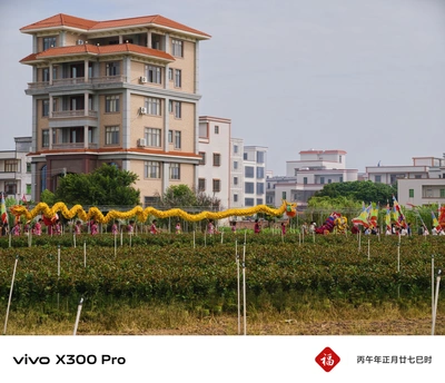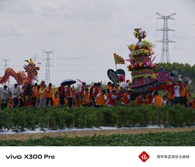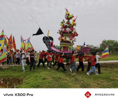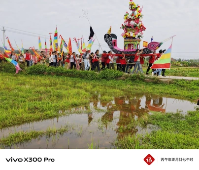 春日的乡间,稻田与菜地间藏着最热闹的年例盛景。 赤金龙身蜿蜒在田埂上,随着鼓点翻腾起伏,倒影在水田里,像把古老的民俗揉进了春光里。 装饰着繁花的花船缓缓前行,彩旗猎猎,红衣队伍簇拥着,把祈福的心意送进每一寸乡土。 白发老人坐在田边静静看着,这是属于岭南乡村最鲜活的仪式感,也是刻在高州人记忆里的年味。 用手机定格下这一幕,烟火气与民俗味撞得刚好,这才是春天最动人的模样。