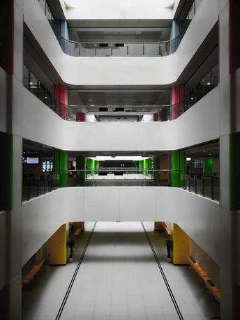 在医院,色彩点缀在建筑之间。