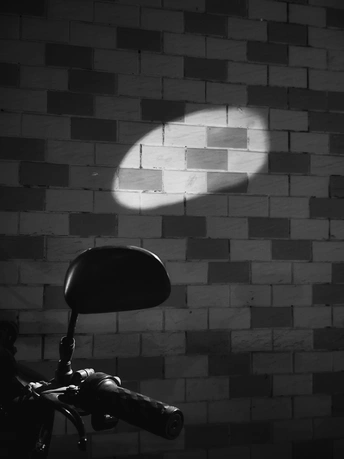 砖墙是沉默的画布,光与后视镜在黑夜里,悄悄画了一个温柔的椭圆。